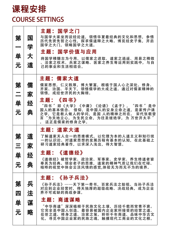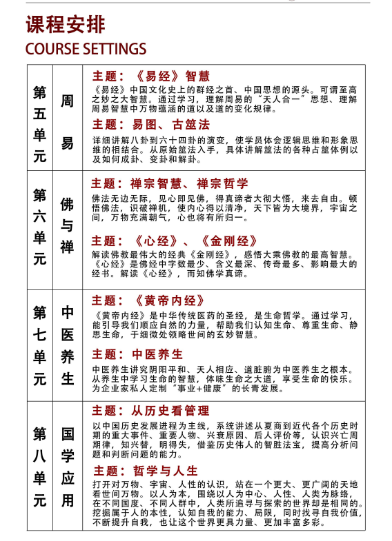 1、全球最负盛名的国学大家授课,让学员站在更高的视野领略国学的魅力与真谛。 2、亲临国学圣地,在古典时空里的仪式感中,切身体悟传统文化之精髓;读经典、学原文、悟原理。赋予经典新的时代感,新旧融贯,推陈出新。 3、开设特色沙龙讲座,如文物鉴赏、养生、茶道、珠宝鉴赏、周易风水等。 4、以班级私董会的形式,定期探讨国学智慧在企业管理中的应用,解决企业管理中的实际问题,学以致用。 5、搭建校友交流平台,创造更多合作机会,为学员打造一个高品质的学习交流圈,找到您志同道合的朋友。
