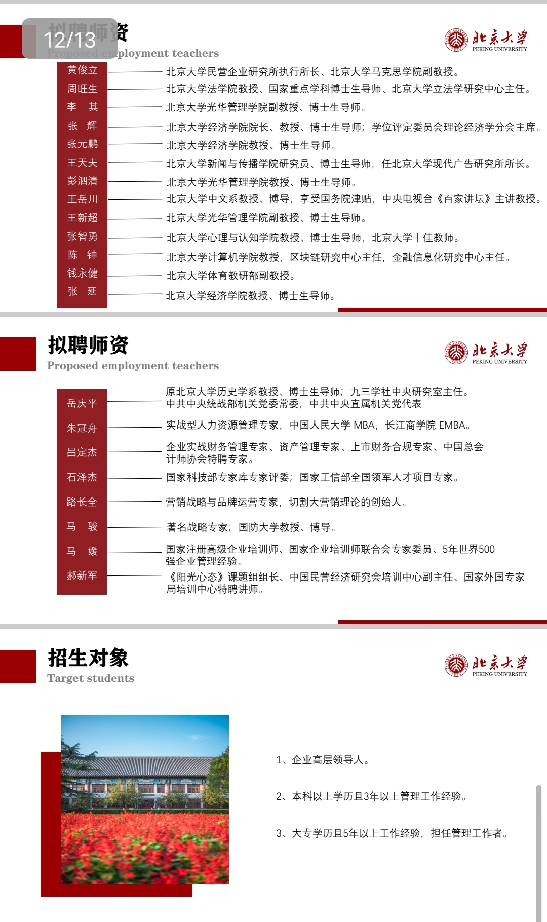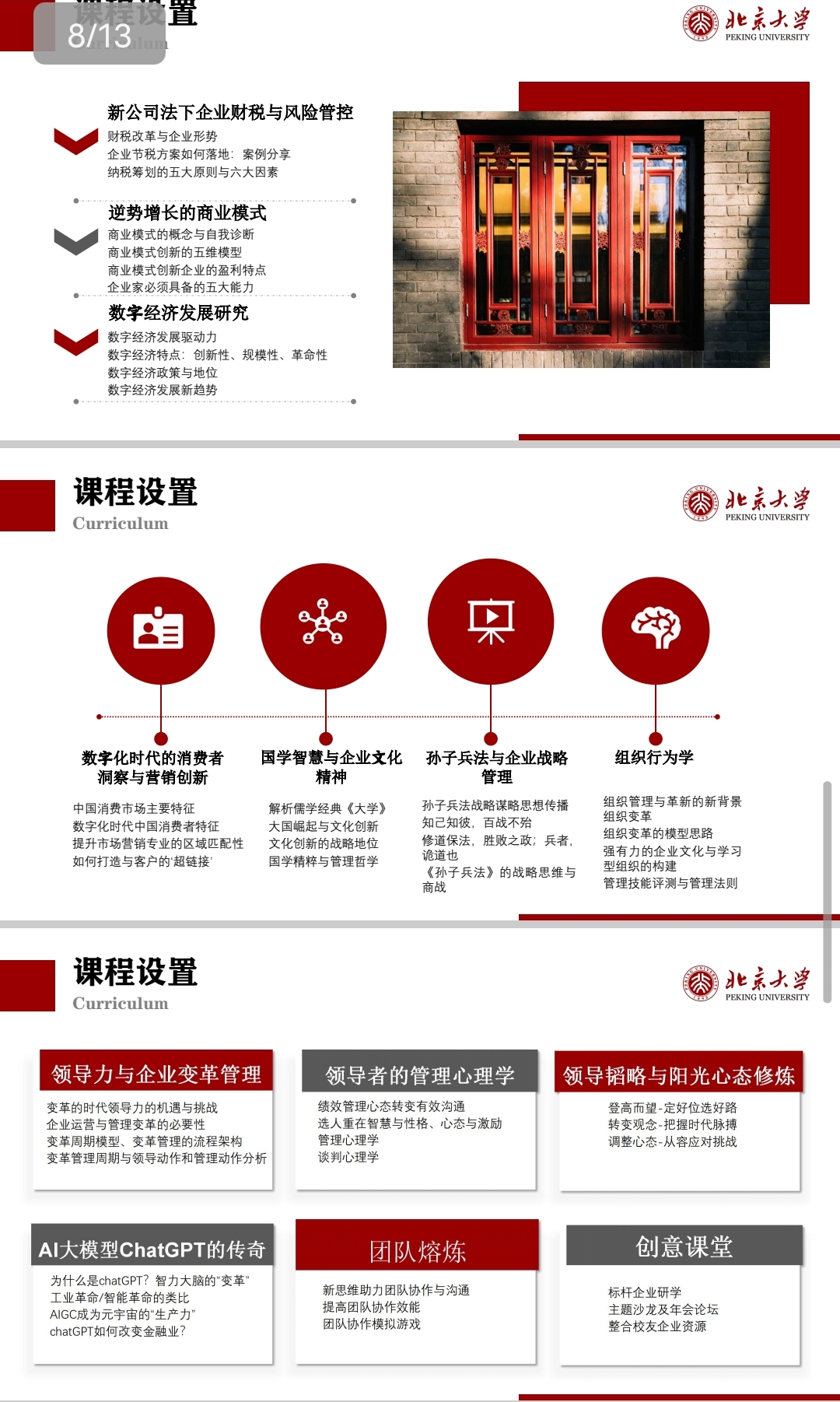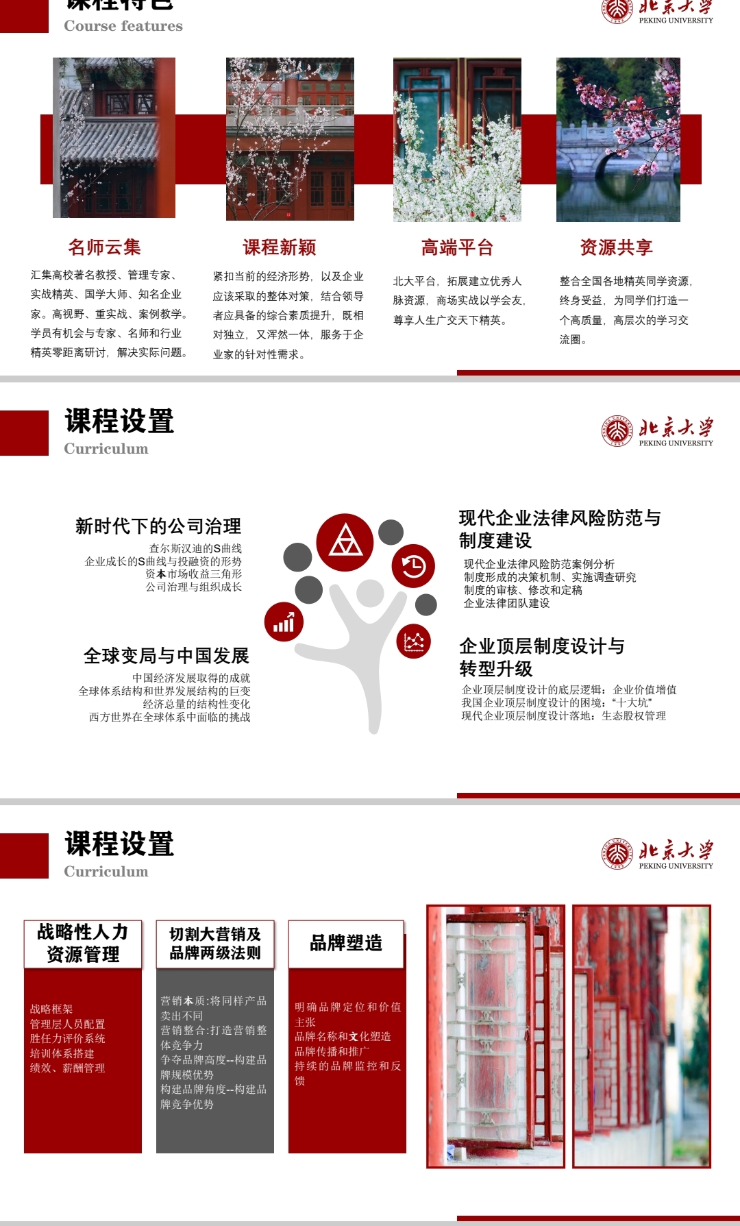 汇集高校著名教授、管理专家、实战精英、国学大师、知名企业家。高视野、重实战、案例教学。学员有机会与专家、名师和行业精英零距离研讨,解决实际问题。 课程新颖,紧扣当前的经济形势,以及企业应该采取的整体对策,结合领导者应具备的综合素质提升,既相对独立,又浑然一体,服务于企业家的针对性需求。 北大平台,拓展建立优秀人脉资源,商场实战以学会友,尊享人生广交天下精英。 高端平台 资源共享整合全国各地精英同学资源,终身受益,为同学们打造一个高质量,高层次的学习交流圈。